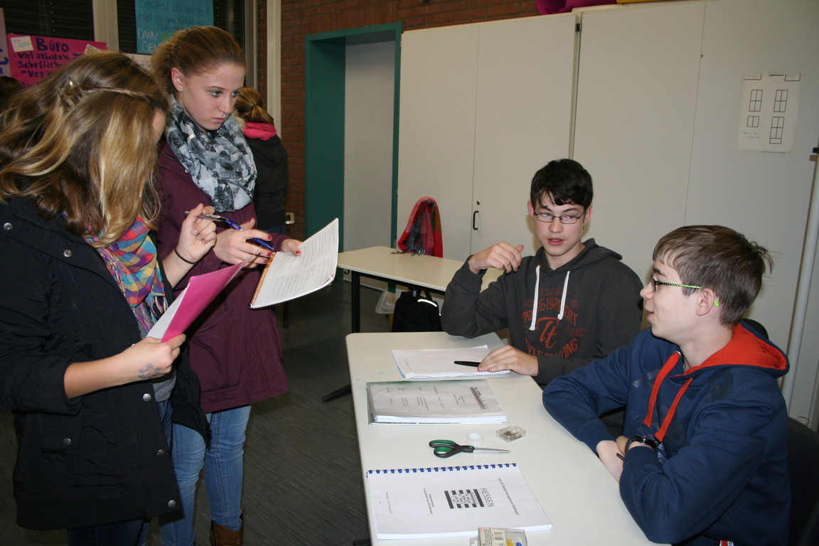 Sie stellten sich an jene Stände, die sie interessierten, und stellten ihre Fragen, welche sie zu den Berufen hatten. Bereitwillig informierte der 9. Jahrgang die 8. Klassen über den Beruf und stellten ihnen Anschauungsmaterial zur Verfügung, wie zum Beispiel Einschätzungstabellen, damit die Schüler besser und schneller herausfinden können, welcher Beruf am besten zu ihnen passt. Nach einiger Zeit, als die Klassen einmal bei jedem Stand vorbei geschaut hatten, wechselten die Klassen. Die jeweiligen zwei Klassen besuchten nun die weiteren „Workshops“ zum Thema „Beruf“ in den anderen Räumen und zwei neue 8. Klassen kamen herein. Dieser Vorgang dauerte eineinhalb Stunden, von 11.30 Uhr - 13.00 Uhr.
